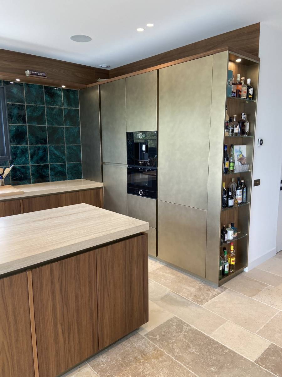 Les façades en mélaminé bois et en laque métallisée confèrent à cette cuisine une esthétique unique. Le mélaminé bois apporte chaleur et authenticité, tandis que la laque métallisée ajoute une touche de modernité et de brillance. Ce mariage de matériaux crée un contraste visuel intéressant et donne à la cuisine une personnalité distincte.