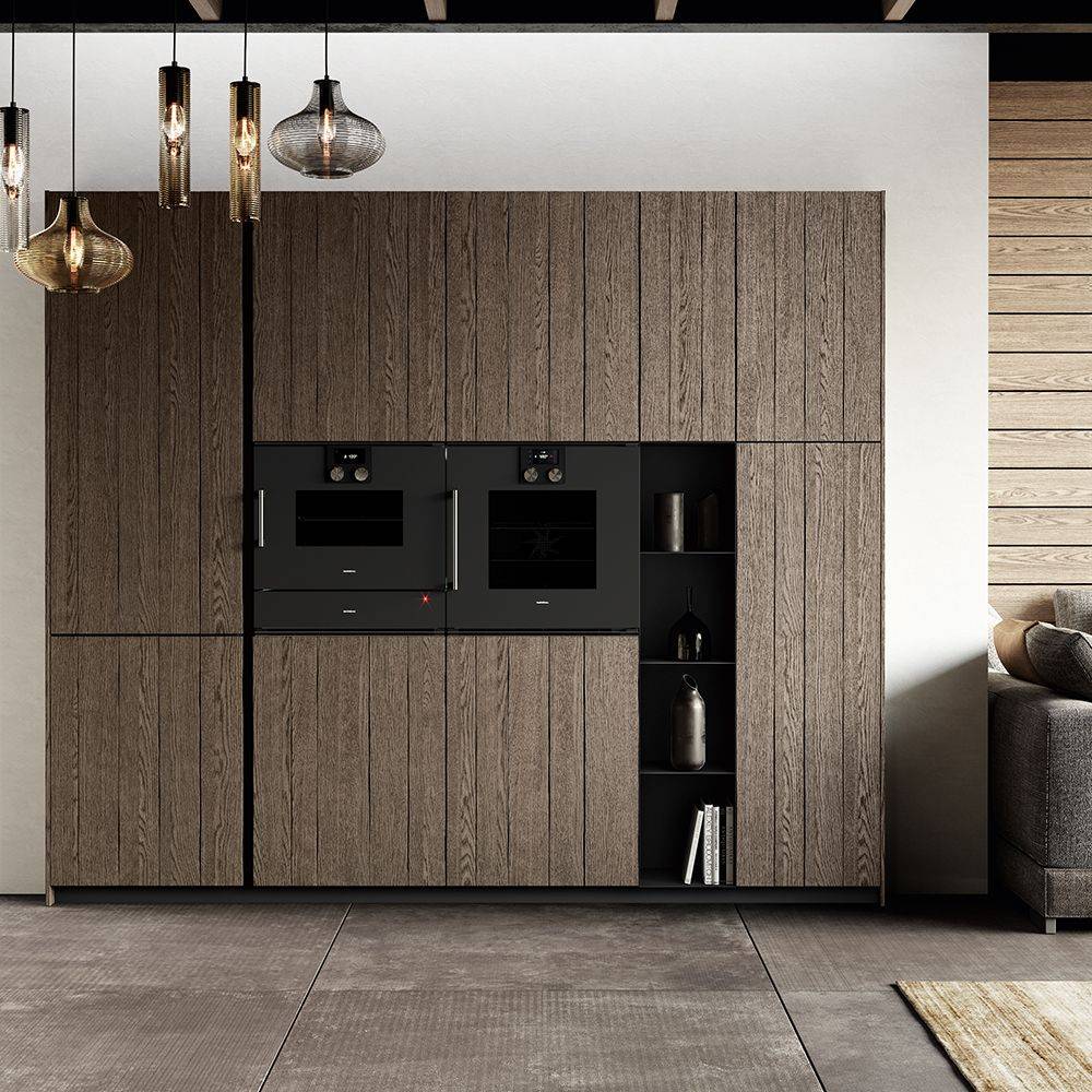 Façade réalisée avec un panneau en bois à faible émission de formaldéhyde couverte des deux côtés d’un placage en noyer, chêne ou frêne et vernie. Chant en bois correspondant.